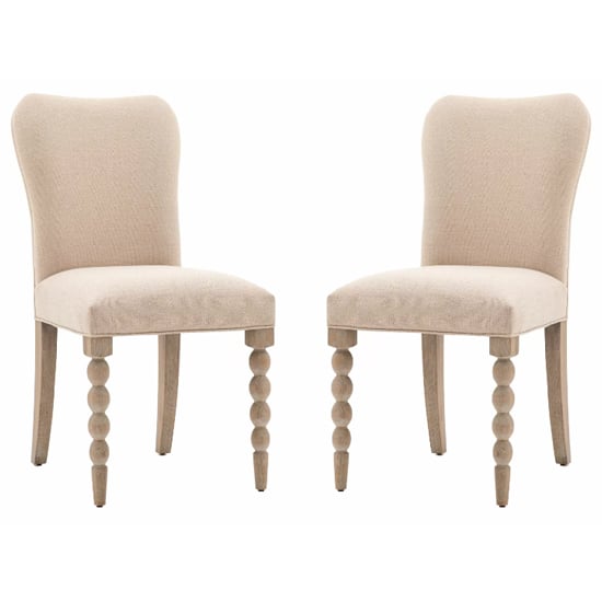 Arta Natural Fabric Dining Chairs In Pair, a tasteful and comfortable addition to your dining space. Crafted with precision, these dining chairs feature a natural fabric upholstery that exudes elegance and versatility. The Arta Dining Chairs seamlessly blend modern design with the timeless appeal of natural fabric, creating a chic and inviting atmosphere. With their sturdy construction and thoughtful details, these chairs not only provide comfortable seating but also enhance the overall aesthetic of your dining area. Whether used with a dining table or as standalone pieces, the Arta Natural Fabric Dining Chairs In Pair elevate your home decor, where quality craftsmanship meets contemporary style for a delightful dining experience. FEATURES : Material : Oak 67% / Oak Veneer MDF 15% / Plywood 8% / Pine 10% Finish : Natural Featuring a fully upholstered seat and beautiful oak legs These stunning dining chairs will make a classy addition to any dining room The front legs feature hand-crafted bobbing detail which is created by turning the wood on a lathe A task carried out by the finest craftsmen The wood has a very subtle lime wash tone to the finish which is soft and mellow Looks beautiful paired with biscuit coloured fabric for the upholstered seat Matching pieces are available Available at an affordable price Images shown are for illustration purpose only DIMENSIONS : Item Width : 470mm Item Depth : 598mm Item Height : 920mm Seat Height : 430mm Seat Width between arms : 470mm Seat Depth : 410mm Leg / Feet Height : 440mm Clearance to Floor : 440mm