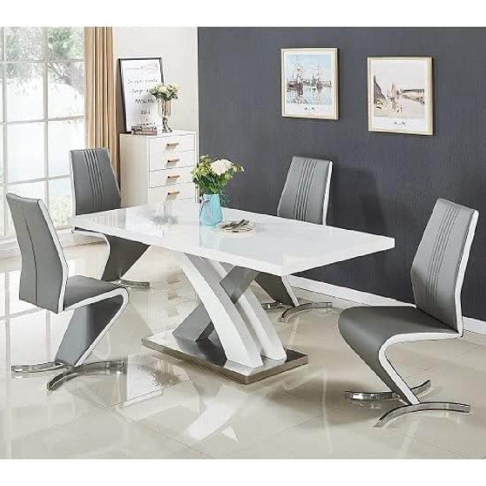 The Axara Large Extending Grey Dining Table Set with 4 Gia Grey and White Chairs is a stylish and practical addition to any modern dining space. This set features a large extending grey dining table and four elegant Gia grey and white chairs that perfectly complement the table’s sleek and minimalist design. The table is crafted from high-quality materials that ensure durability and longevity. Its extending feature allows it to accommodate even more guests when needed, while its easy-to-use extension mechanism makes it simple to extend the table to your desired length. The table’s rectangular shape provides ample space for meals and gatherings, making it ideal for entertaining family and friends. The four Gia grey and white chairs are comfortable, durable, and designed to complement the table’s modern style. They feature a sturdy frame and supportive backrest that provides added comfort during long meals. The Axara Large Extending Grey Dining Table Set with 4 Gia Grey and White Chairs is perfect for use in a dining room or kitchen, and can easily be paired with a variety of different decor styles. Whether you’re hosting a dinner party or enjoying a casual meal with family and friends, this set is an excellent choice for your home. FEATURES : Table Material : MDF (Medium Density Fibreboard), Stainless Steel Table Finish : White And Grey High Gloss, Polished Stainless Steel Chair Material : Faux Leather, Stainless Steel Chair Finish : White And Grey, Chrome Axara Extendable Large Dining Table In White And Grey High Gloss White And Grey High Gloss And Stainless Steel Base Structure MDF High Gloss lacquered Wood Lacquered Base Contour in Stainless Steel Stylish ‘X’ Shape White And Grey High Gloss Support The Surface is Waterproof and Can be Cleaned Very Easily It Can Easily Extended into 120 to 160cm By its Clever System of Central Extension 4 x Gia Dining Chairs In Grey Faux Leather With Chrome Base Grey And White Faux Leather Slightly Curved